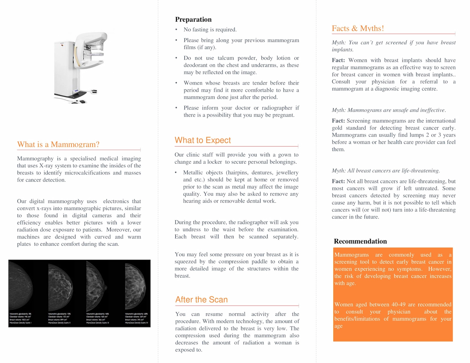 Moreover, our machines are designed with curved and warm plates to enhance comfort during the scan. As the risk of developing breast cancer increases with age, women between 40-49 years of age are recommended to consult your physician about the benefits/limitations of mammograms for your lifestyle.
